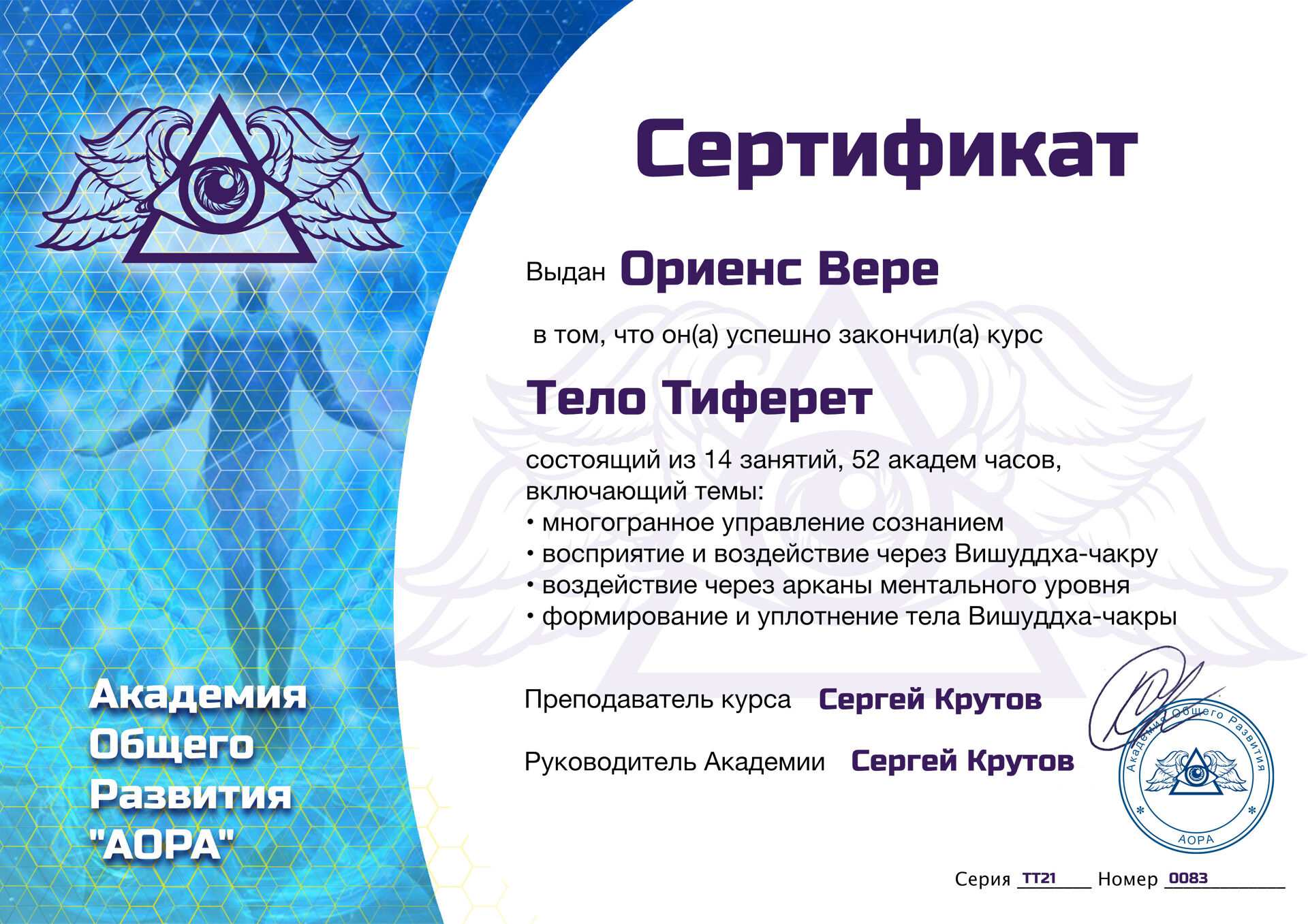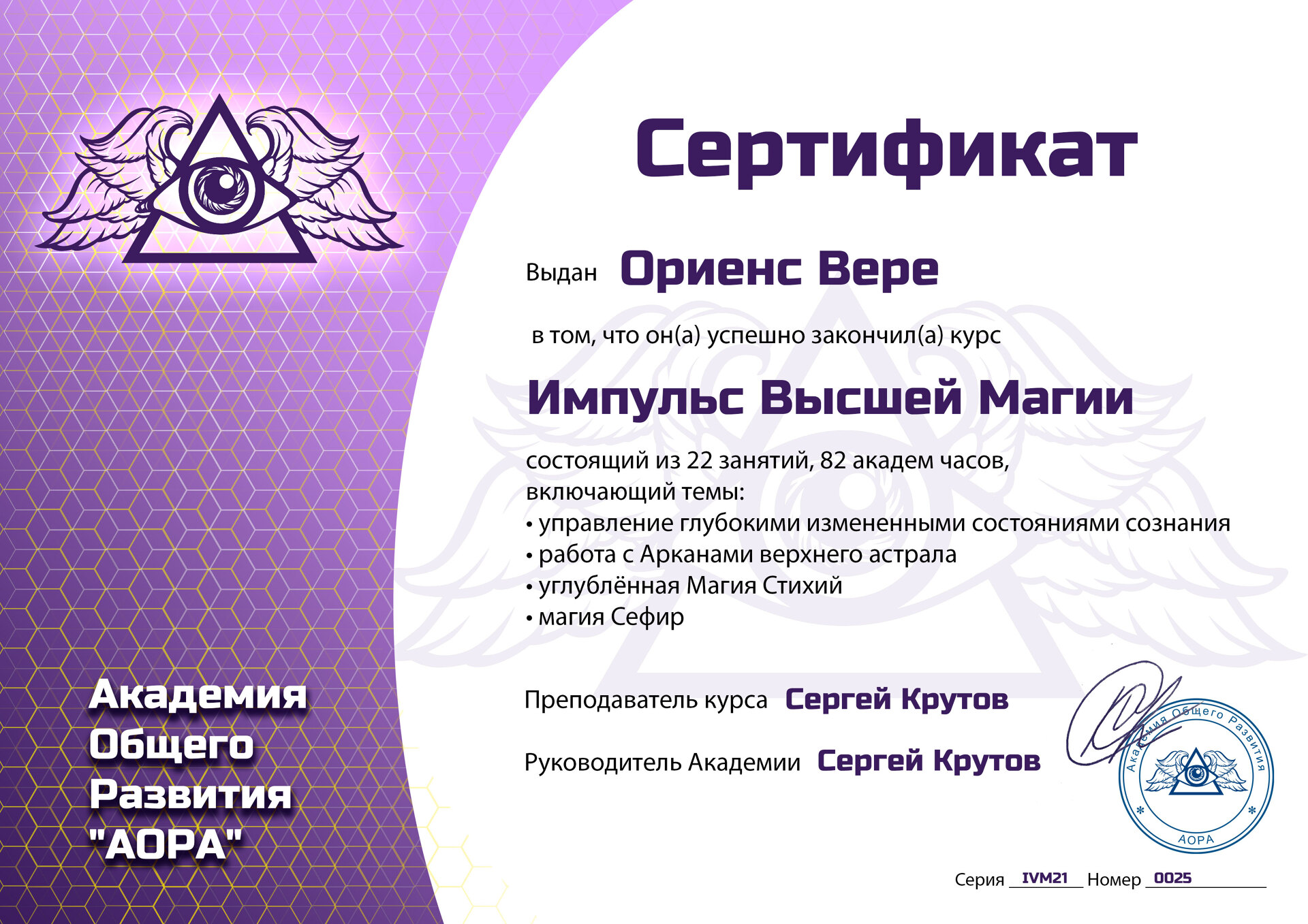 Vera Oriēns: «Моя миссия - это развитие и популяризация учения сефиротической философии и передача знаний о возможностях человеческого сознания. Я хочу, чтобы в нашем обществе увеличивалось количество людей, которые развивают себя, повышают свой культурный уровень, превращают свои жизни в шедевры и делают мир вокруг лучше. Ведь, как известно, мир вокруг отражает то, что есть внутри. Развивайте сознание - творите свою реальность!».